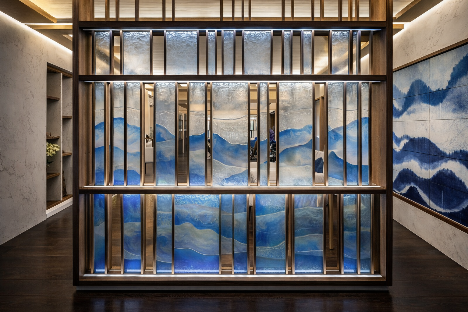 餐敘與吧台區則以「海」作為主要意象。 整面藍色藝術玻璃隔屏,以層層暈染的色階描繪水域流動,彷彿將遠洋風景引入室內。