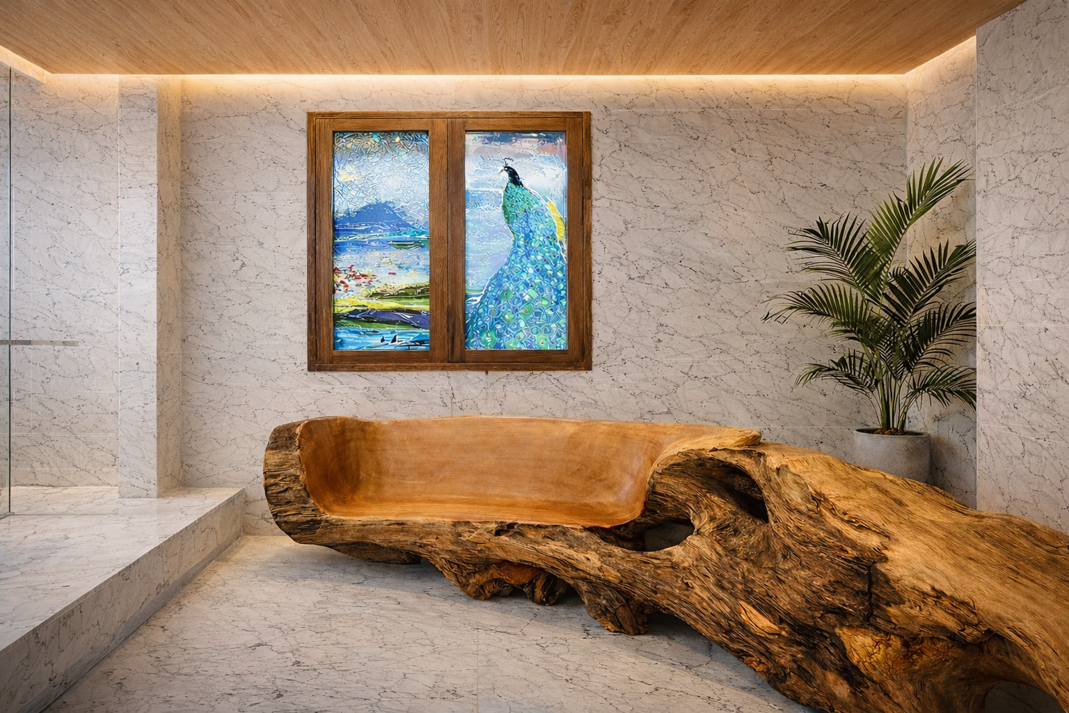 光線穿透玻璃後映照地面與木構架,隨時間推移呈現不同層次的光影變化,使空間始終保持流動感。