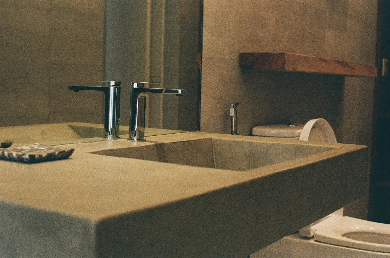 清水模牆面搭配實木檯面與白色陶瓷面盆,