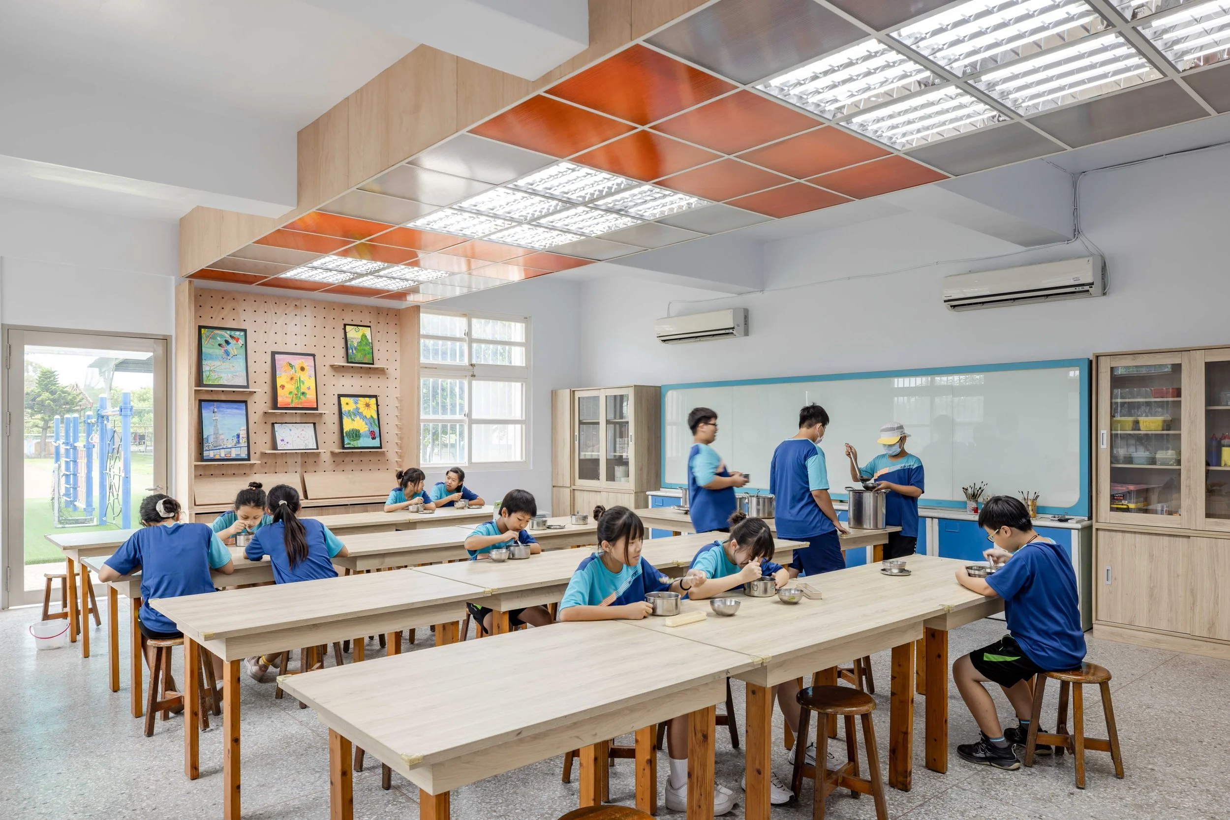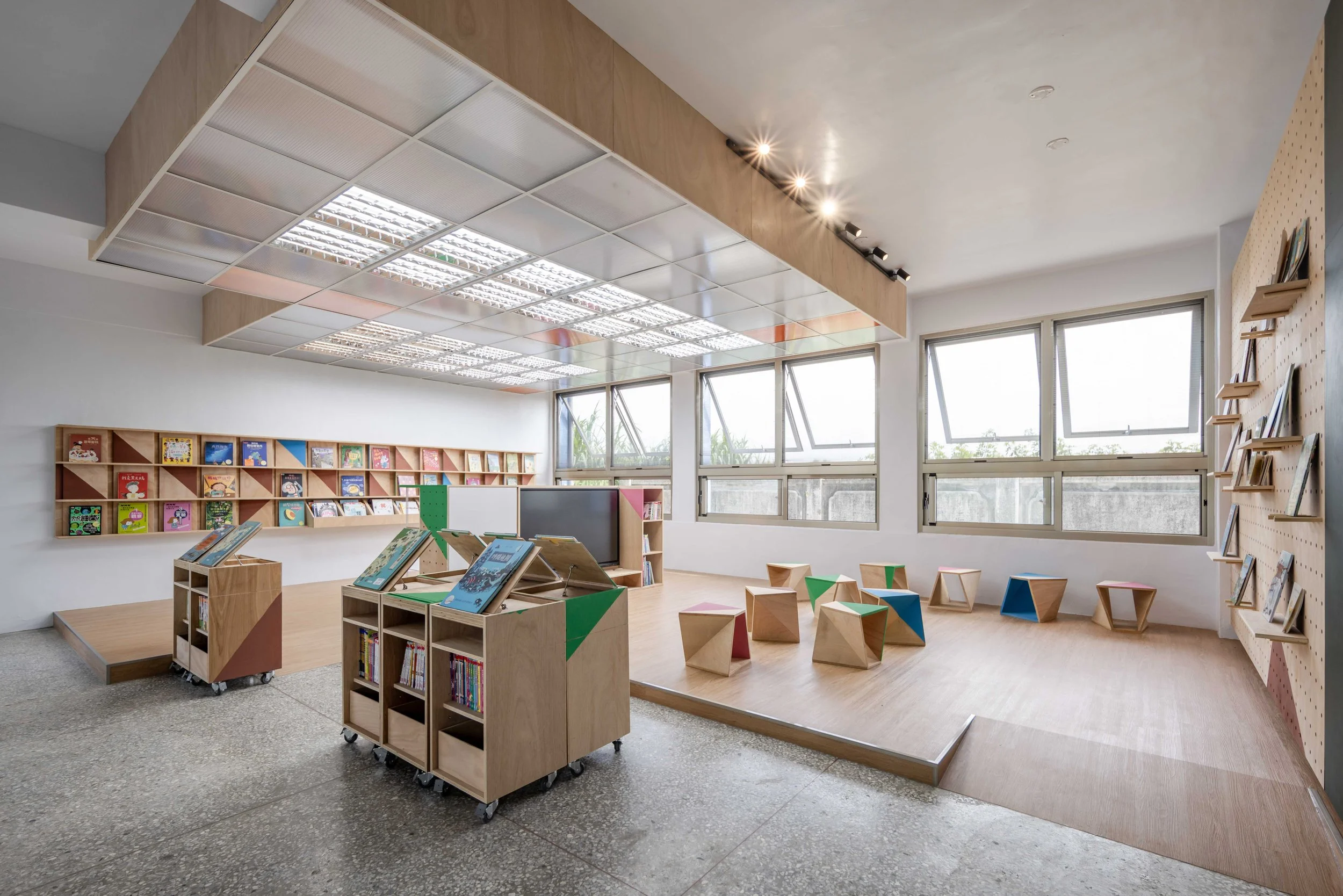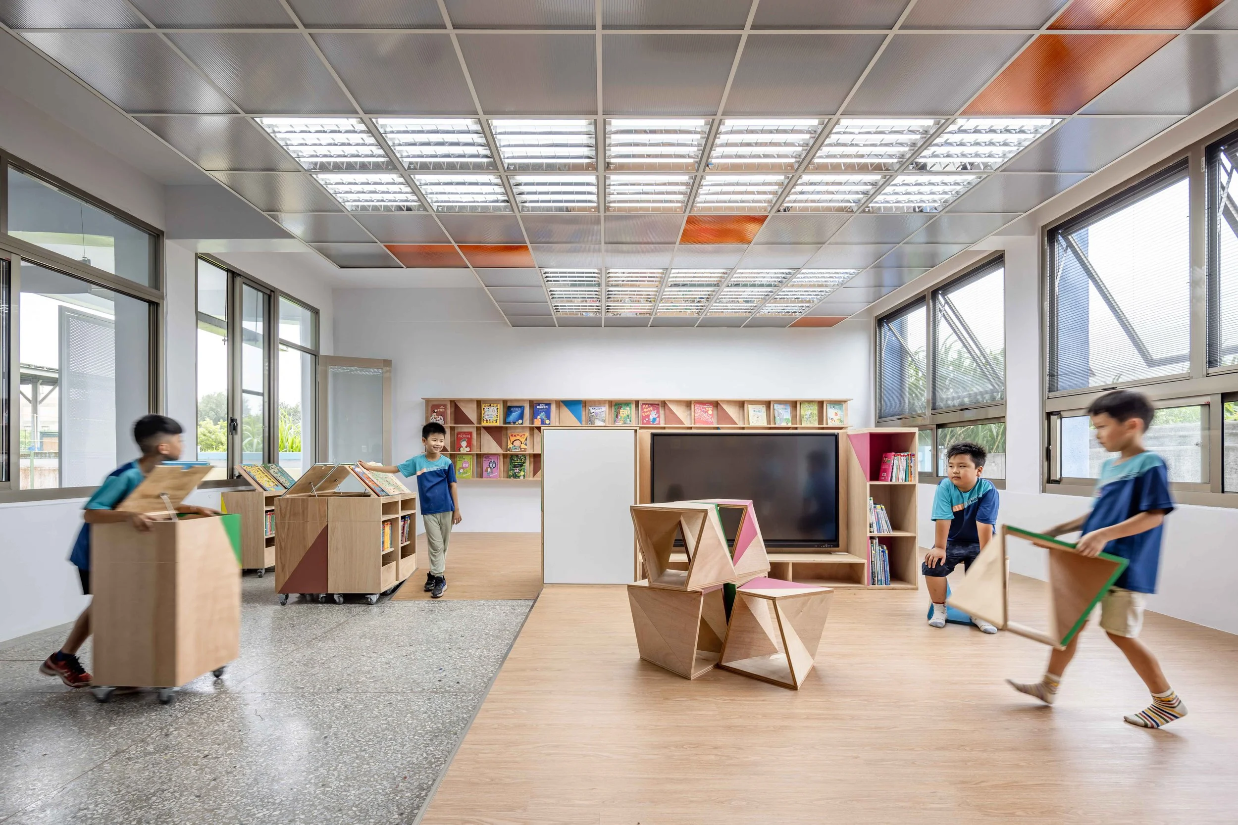閱讀室與美勞教室則透過一致造型的燈架與走廊中彼此呼應的小屋簷,建立視覺連續性,讓原本分散的空間整合成一個完整區域。