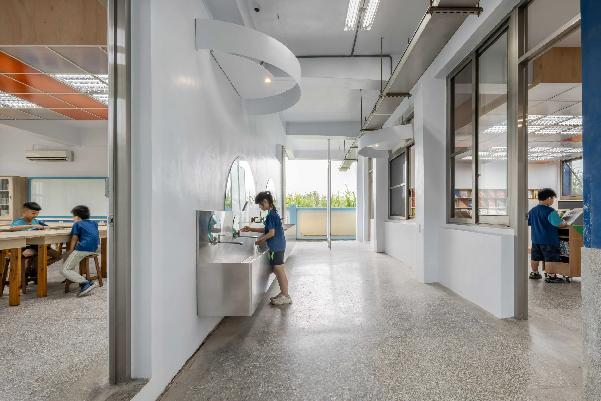走廊中雜亂的彩繪與海報被移除,洗手台重新整合並依孩童身高配置,讓動線回到清爽、有序的狀態。